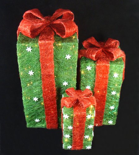 I wanna tell you that was given 3-Piece Tall Sparkle Green Sisal Gift Box Lighted Christmas Yard Art Decorations - products not too long ago. It been effectived exactly as discounted. Perfect product. Users welcoming to the points that I did not need to have to browse any information to operate. Delighted I made the get. I would often recommend this unit to you.